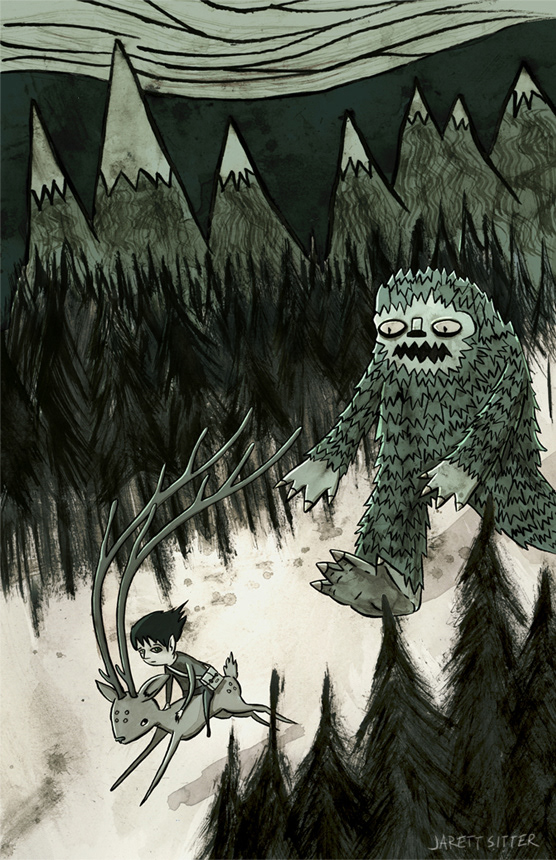 Abominable Snowman chasing an elf riding a reindeer. I used this image for my Christmas Cards in 2012.