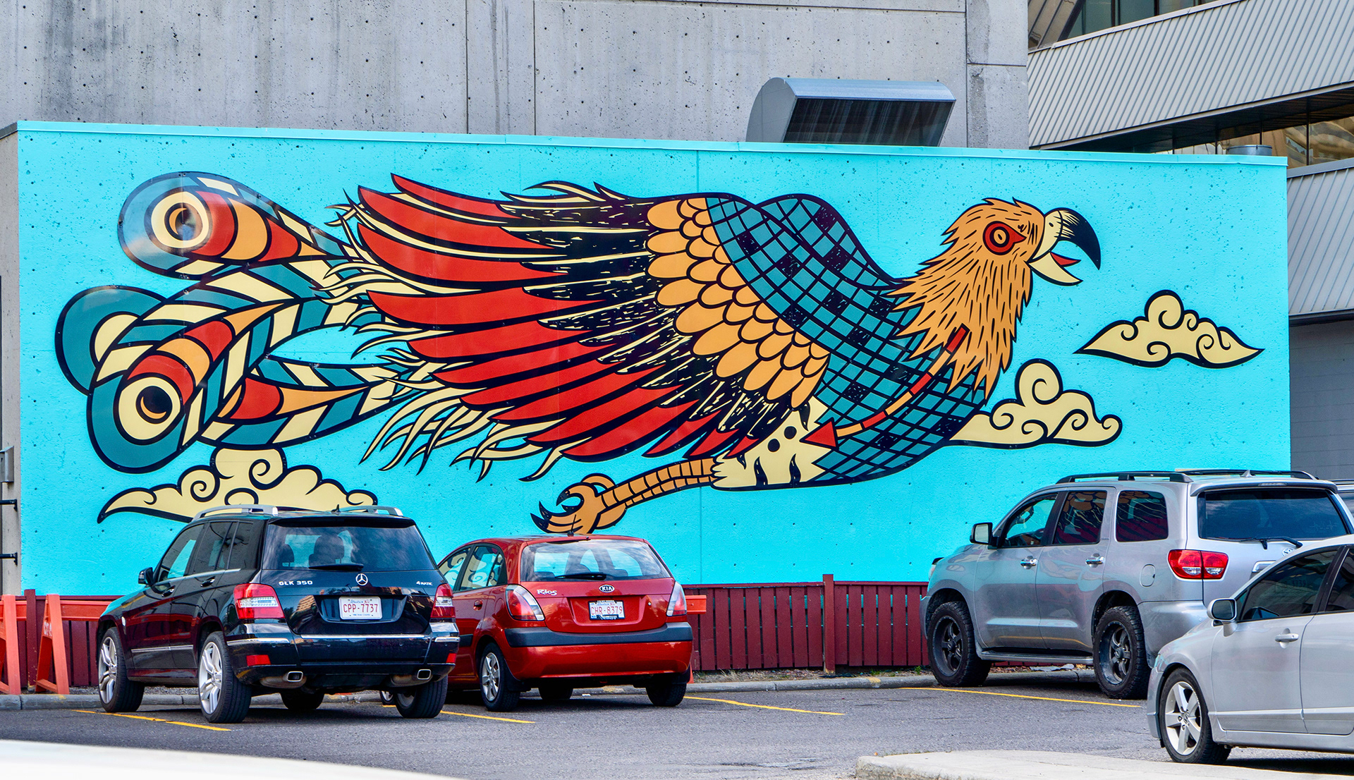 In the tradition of Yin and Yang, which describes opposite but interconnected forces, Yang is the masculine and Yin is the feminine. In Chinese mythology, Yang is often represented by The Dragon and Yin by The Phoenix or Fènghuáng. Fittingly this phoenix flies alongside the Calgary Immigrant Women's Association (CIWA) building. Within the western world the phoenix is often thought of as a symbol of rebirth, and although the Chinese Phoenix does not go through the same cyclical regeneration as the mythological Greek creature who shares its namesake, it can still mark the beginning of a new era. As well, it is a symbol of honesty, truth, majesty, strength, courage, wisdom, power and freedom. Showing it in flight also evokes the idea of the travels women have made to this country, and the immigrant story they share with the early Chinese that came here.