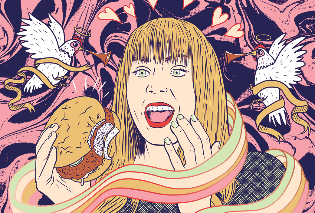 Vegan chicken sandwich illustration for Cincinnati Magazine article chronicling the author's search for the perfect one, as well as a series of spots for their fried chicken feature.