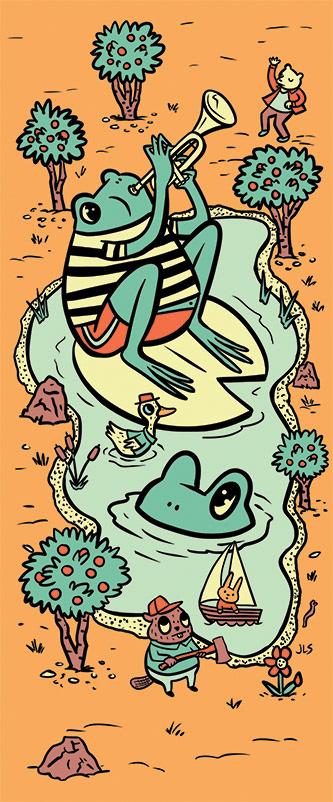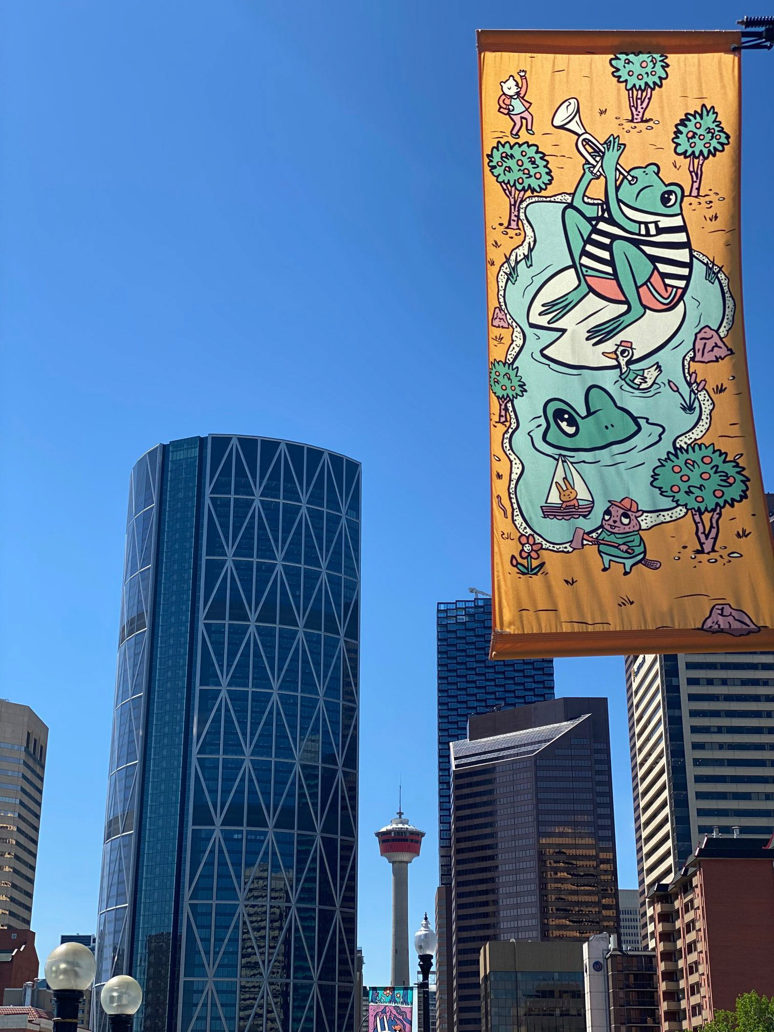Frog Banner I was selected to be the 2021 Centre City Banner artist for the City of Calgary, my series of instrument playing animals was featured throughout the downtown area of Calgary.