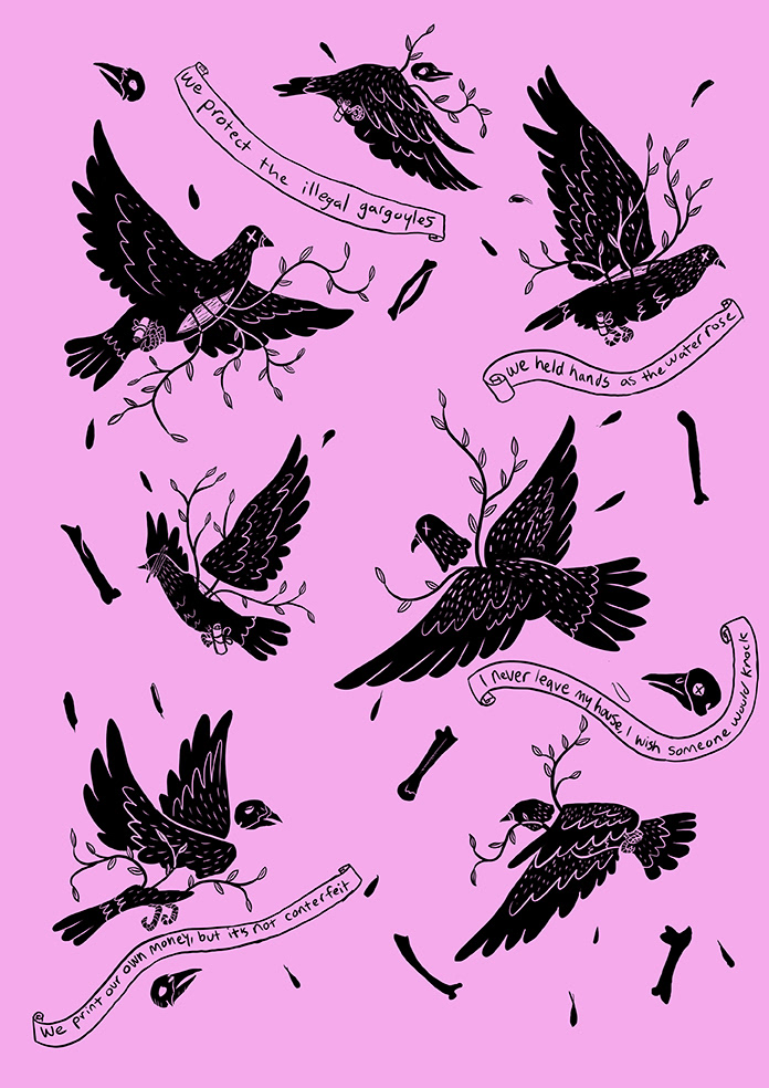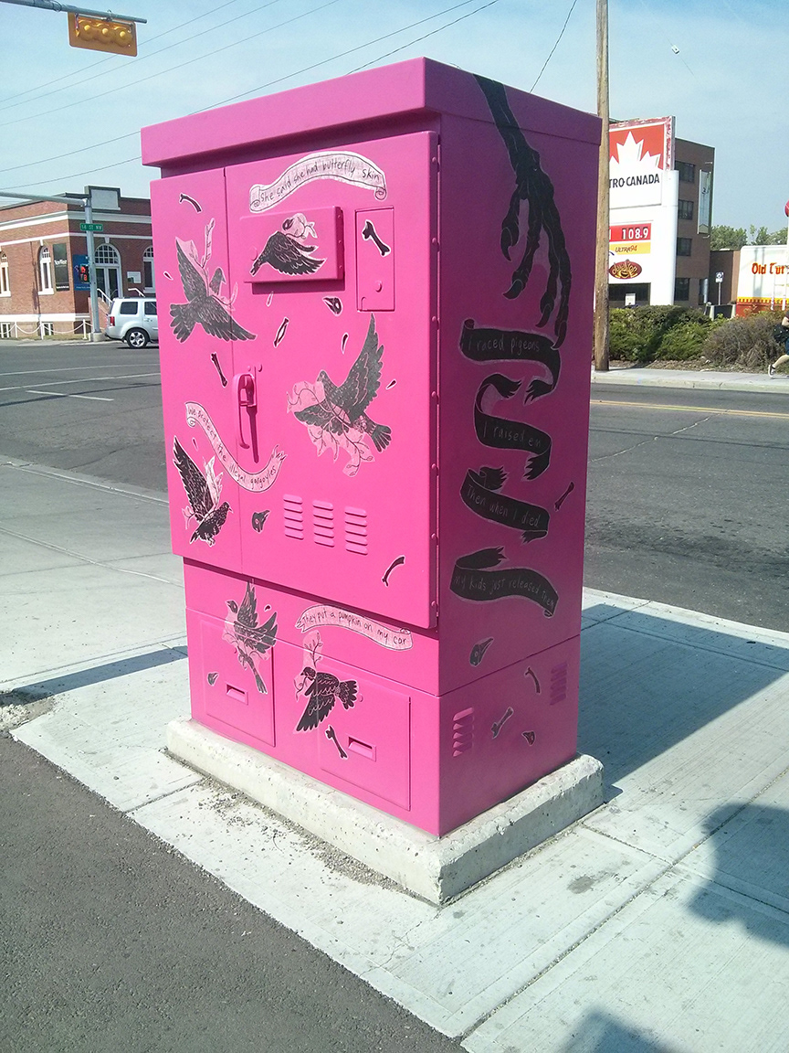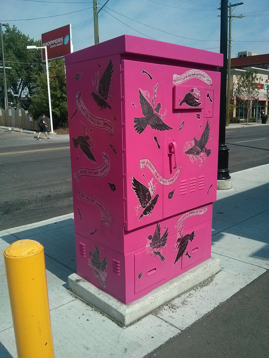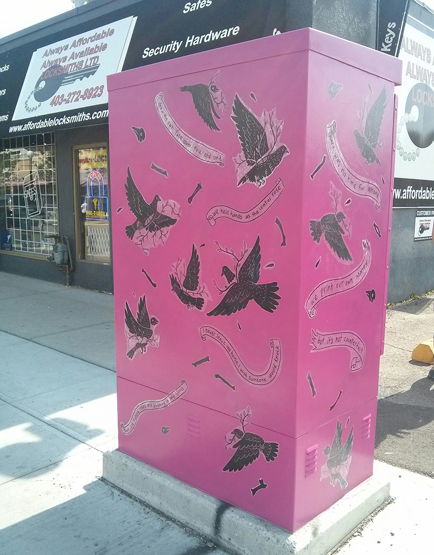 This utility box features the above mentioned racing pigeons I had learned about. These pigeons are flying among bones as well as bursting with foliage, embracing the duality of life and death. It serves as a remembrance of the birds who for a time flew nearby, and pay homage to them by showing small messages a carrier pigeon could possess, spilling out from them. These messages each are inspired by, or directly quoted from people we had talked with around the community. Whether it be admissions, snippets of heard conversation, or anecdotal, these messages we are able to intercept mid-flight act as a record of people's everyday lives in Kensington.