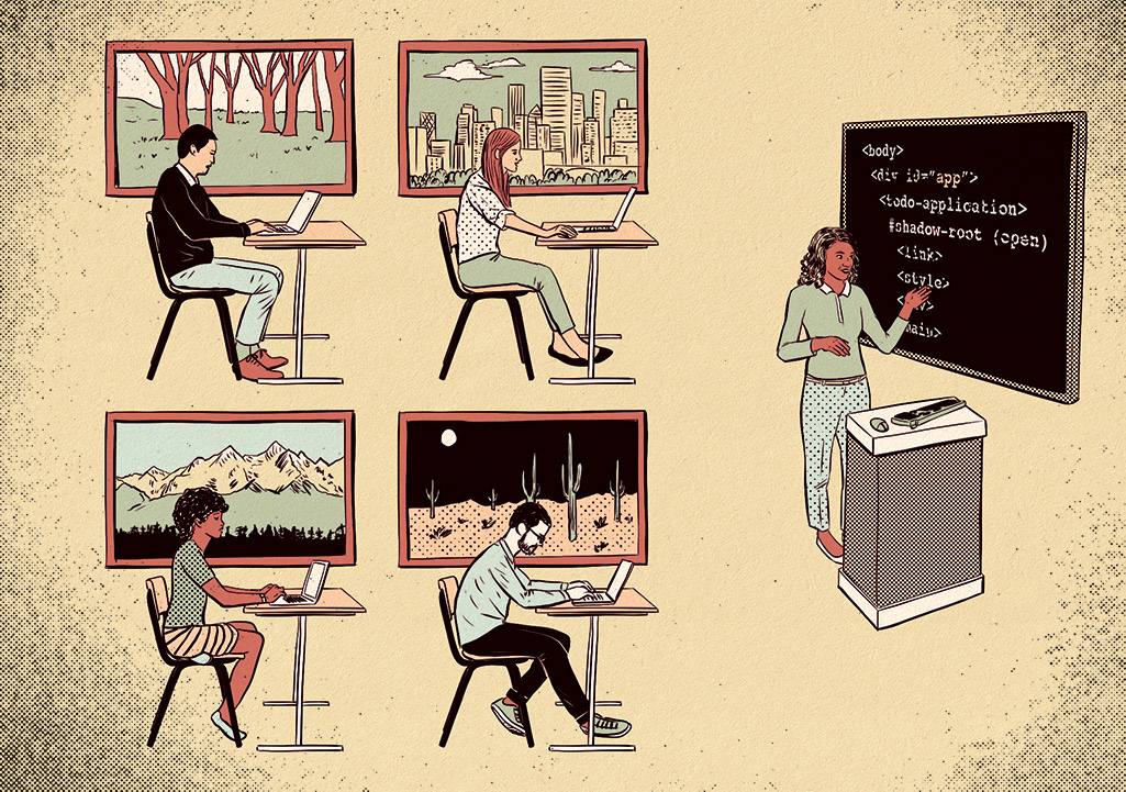 Editorial illustration for Maclean's Magazine article "Are private training companies like Juno College an alternative to a computer science degree?"