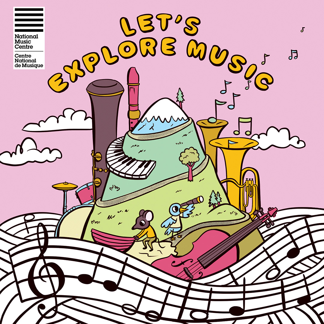 Illustrations including cover image for zine put out by the National Music Centre for students pre-k to grade 2, which helps them explore and learn about music/sound and the NMC exhibitions.