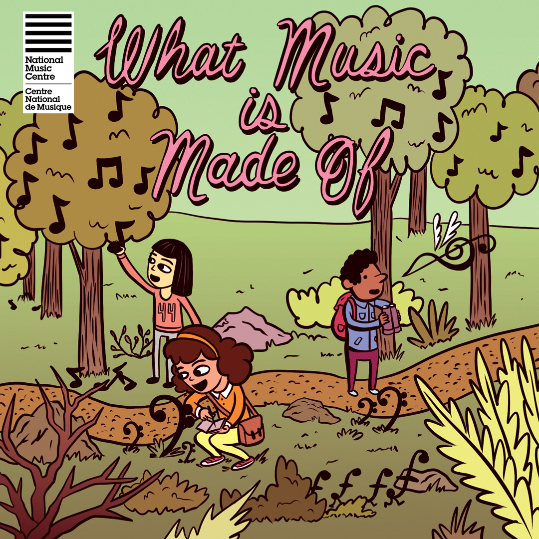 Illustrations including cover image for zine put out by the National Music Centre for students grade 3 to 6, which helps them explore and learn about music/sound and the NMC exhibitions.