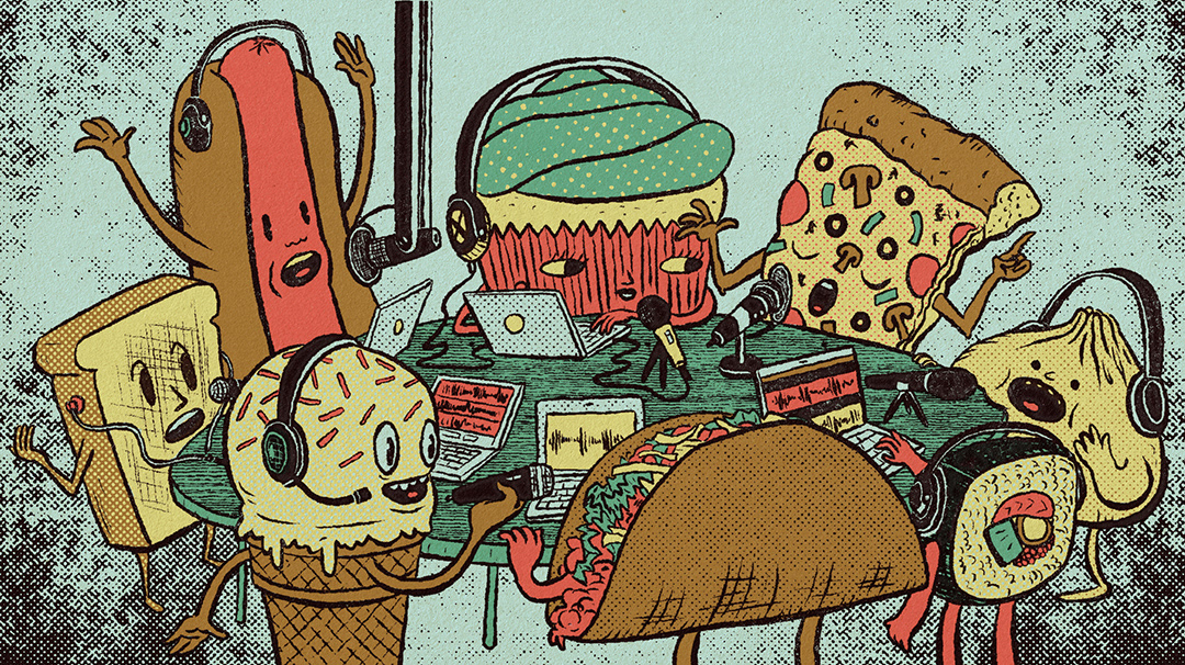 Editorial illustration for TASTE article "Let’s Turn Up the Volume on the Food Podcast".