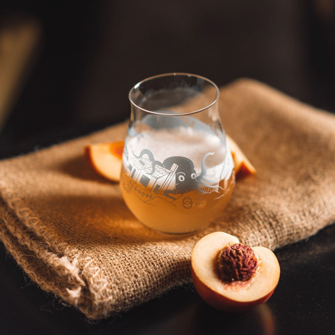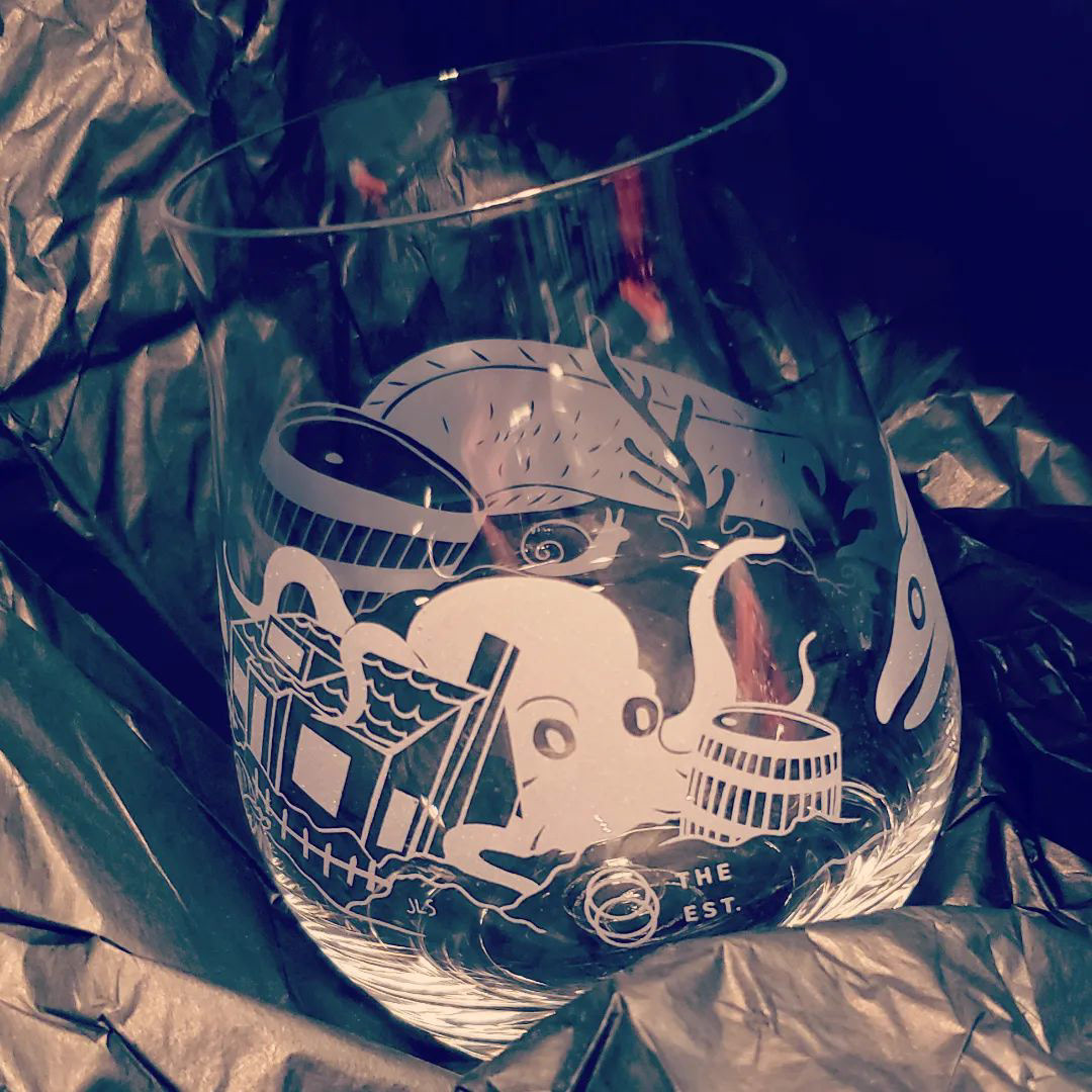 Glassware designed for Establishment Brewing. This glass is used exclusively for their barrel aged beer in the taproom, so I decided to make sure that the barrel theme was prominent on the glass. I wanted to tell a bit of the story of Establishment Brewing as well, so I have a flooded house at the bottom of an ocean of beer when the glass is half full, speaking to how they made the best of a bad situation when the founder's home was flooded leading to the eventual brewery. The barrels are scattered along the ocean bed like sunken treasure chests, and around them new life is being born out of the chaos of the flood.