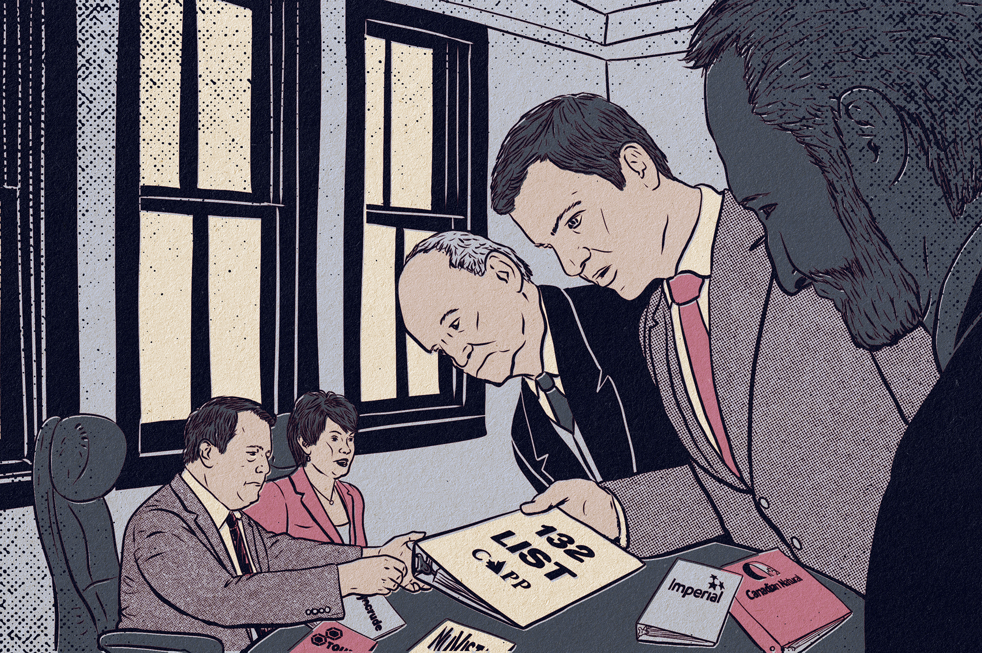 Illustration for The Narwhal to accompany an investigative article about documents revealing how Alberta oil and gas industry used the pandemic to push their ‘wish list'.